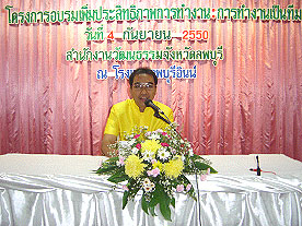 เมื่อวันที่ ๔ กันยายน ๒๕๕๐ สำนักงานวัฒนธรรมจังหวัดลพบุรี จัดโครงการอบรมเพิ่มประสิทธิภาพ การทำงาน (การทำงานเป็นทีม) ณ โรงแรมลพบุรีอินน์ อำเภอเมือง จังหวัดลพบุรี นายวรเทพ ปิสาวงษ์ วัฒนธรรมจังหวัดลพบุรี เป็นประธานในพิธีเปิด และบรรยายพิเศษ เรื่อง หลักการทำงานเป็นทีม มีผู้เข้าอบรมจาก หน่วยงานต่าง ๆ ในจังหวัดลพบุรี |
