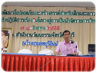 โครงการพัฒนาสื่อปลอดภัยและสร้างสรรค์ สำหรับเด็กและเยาวชน ประจำปี ๒๕๕๕ (การฝึกอบรมเชิงปฏิบัติการ เรื่อง " เส้นทางสู่การเป็นนักจัดรายการวิทยุ") วันที่ ๗ - ๘ สิงหาคม ๒๕๕๕ ณ โรงแรมลพบุรีอินน์ อำเภอเมืองลพบุรี จังหวัดลพบุรีี ดูรายละเอียด |