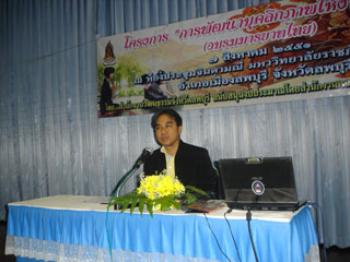 7 สิงหาคม 2551 ณ มหาวิทยาลัยราชภัฏ เทพสตรี อำเภอเมือง จังหวัดลพบุรี เพื่อให้บุคลากรในส่วนภูมิภาคสามารถเป็นวิทยากรมารยาทไทยและขยายผลให้กับเยาวชนในสถา่นศึกษาได้ปฏิบัติอย่าง ถูกต้อง เป้าหมาย จัดอบรมบุคลากรในสถานศึกษา จำนวน 70 คน โดยมีนายวรเทพ ปิสาวงษ์ วัฒนธรรมจังหวัดลพบุรี เป็นประธานในพิธี |