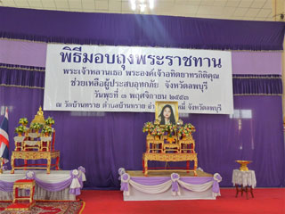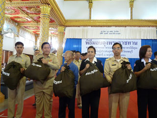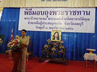 | สำนักงานวัฒนธรรมจังหวัดลพบุรี ร่วมกิจกรรมมอบถุงยังชีพพระราชทานแก่ราษฎร ที่ประสบอุทกภัย จากพระเจ้าหลานเธอ พระองค์เจ้าอทิตยาทรกิติคุณ เมื่อวันที่ ๓ พฤศจิกายน ๒๕๕๓ ณ ศาลาการเปรียญวัดบ้านกล้วย และศาลาการเปรียญวัดบ้านทราย อำเภอบ้านหมี่ จังหวัดลพบุรี โดยมีนายบุญเชิด กันภัย ผู้แทนพระองค์ พระเจ้าหลานเธอ พระองค์เจ้าอทิตยาทรกิติคุณ เป็นตัวแทนมอบถุงยังชีพพระราชทานแก่ราษฎร |