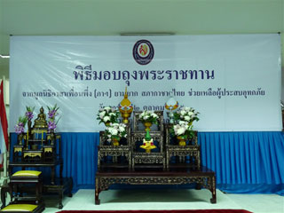 | สำนักงานวัฒนธรรมจังหวัดลพบุรี ร่วมกิจกรรมมอบถุงยังชีพพระราชทานแก่ราษฎร ที่ประสบอุทกภัย จากมูลนิธิอาสา เพื่อนพึ่ง (ภาฯ) ยามยาก สภากาชาดไทย เมื่อวันที่ ๒๒ ตุลาคม ๒๕๕๓ ณ ห้องโถง ชั้น ๑ ศาลากลางจังหวัดลพบุรี อำเภอเมืองลพบุรี จังหวัดลพบุรี โดยมีนายอภัย จุลกะ ผู้แทนพระองค์ พระเจ้าหลานเธอ พระองค์เจ้าพัชรกิติยาภา เป็นตัวแทน มอบถุงยังชีพพระราชทานแก่ราษฎร |