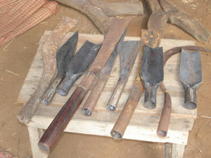 นายสมศรี คำผาย มีความสามารถในการตีเหล็ก ประกอบเป็นมีดพร้า มีดอีโต้หัวตัด มีดโตม๊อก เสียม เคียว มีดแหลม มีดตอก ดาบ หรืออื่น ๆ ได้ทุกประเภท ตามแต่ความต้องการของลูกค้า โดยใช้เหล็กแหนบรถมาเผาไฟให้อ่อน แล้วนำมาตัดเป็นรูปร่างที่ต้องการ จากนั้นนำไปเผาไฟอีกครั้ง แล้วนำมาตีเป็นรูปร่างตามต้องการ สำหรับการขายจะมีลูกค้ามาติดต่อ รับซื้อถึงที่ มีรายได้ประมาณเดือนละ ๔,๐๐๐-๕,๐๐๐ บาท