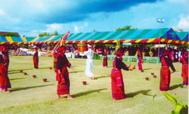 เช่นเดียวกัน จากนั้นก็ฟ้อนแสดงการละแล่นต่าง ๆ เริ่มด้วย แห่เทียนเข้าพรรษา อันแสดงถึงความแนบแน่นในพุทธศาสนา เล่นเป็นหนุ่ม