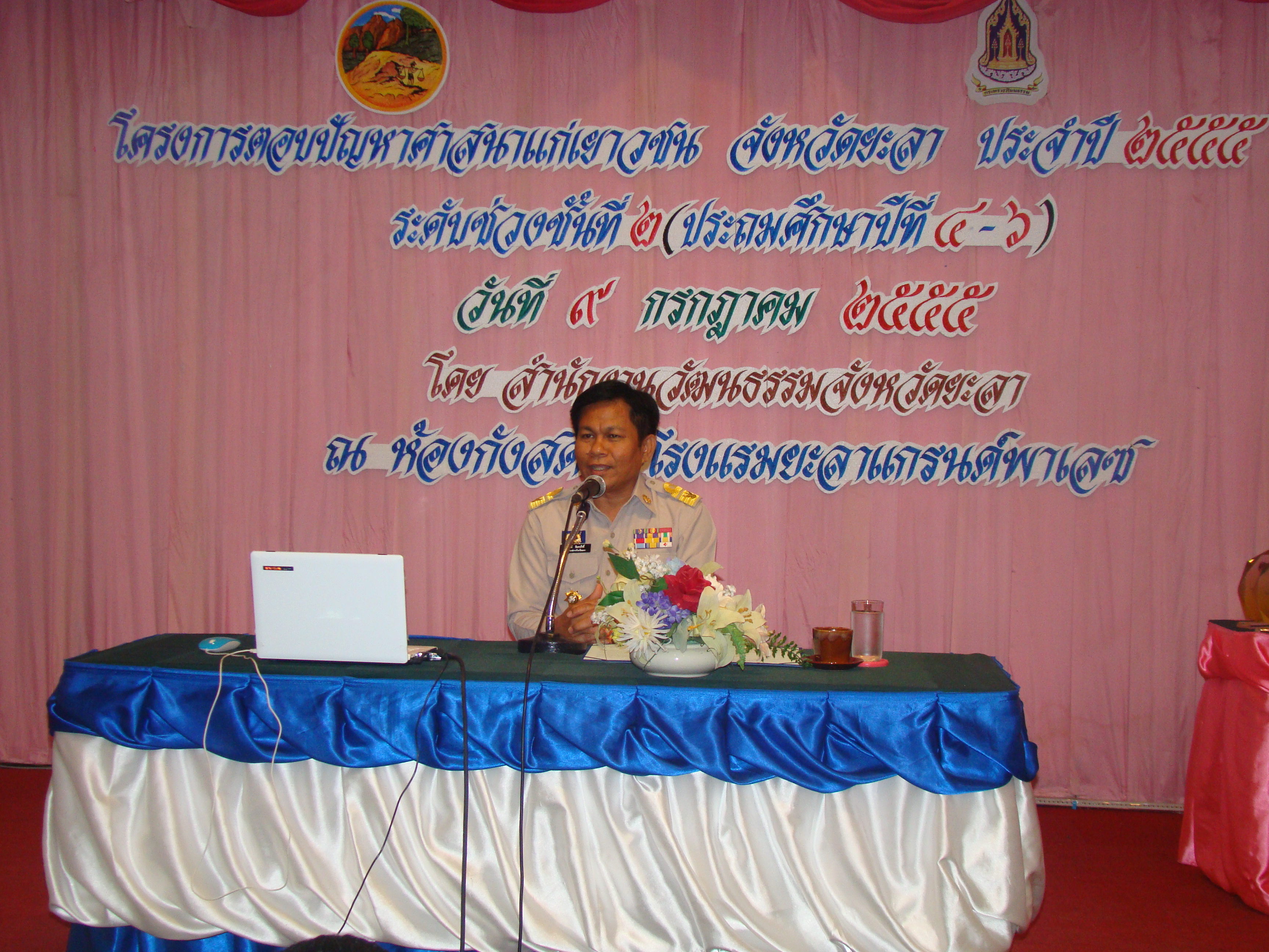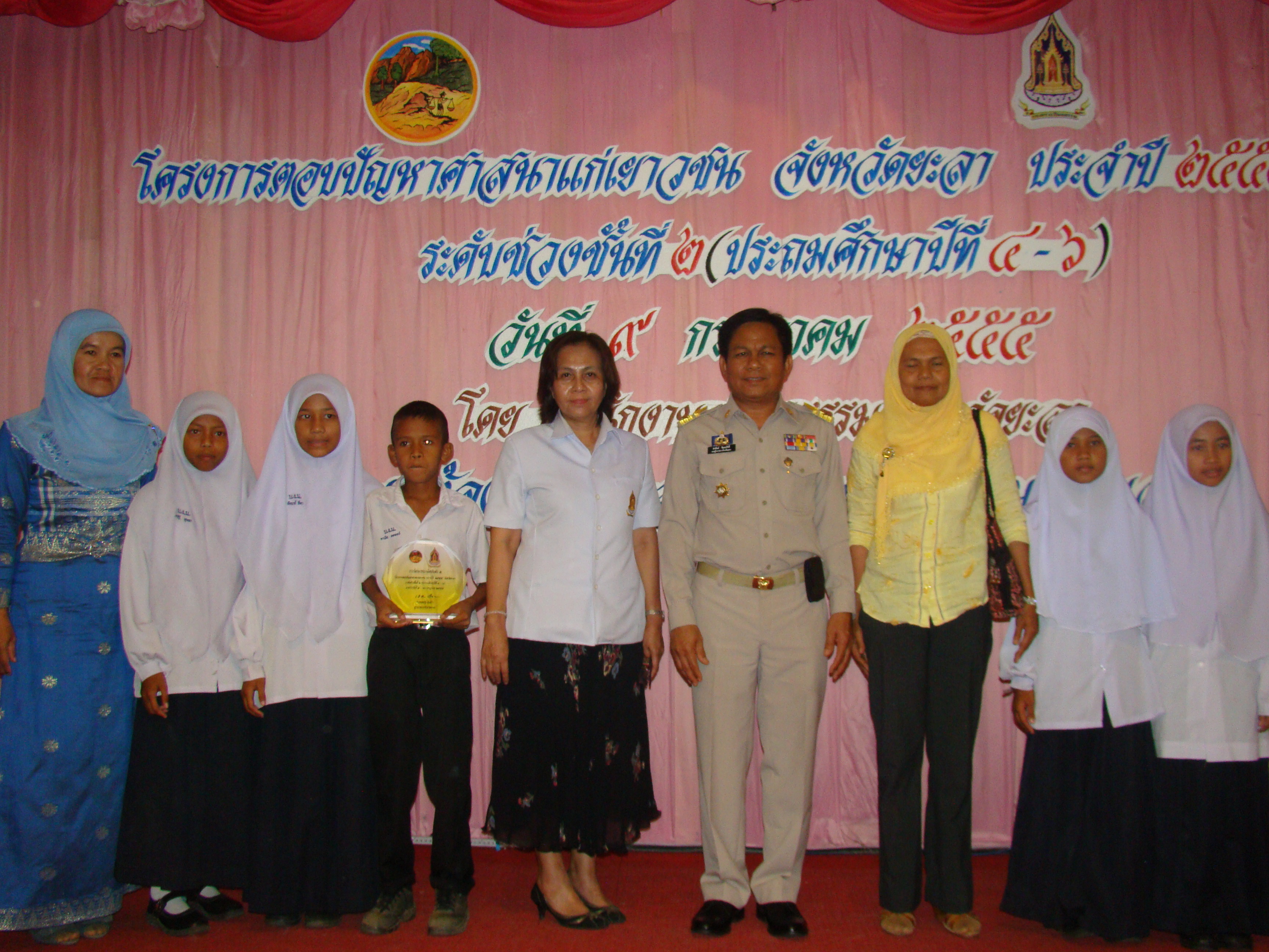 วันจันทร์ ที่ ๙ กรกฎาคม ๒๕๕๕ นายสายัณห์ อินทรภักดิ์ รองผู้ว่าราชการจังหวัด เป็นประธานพิธีเปิด โครงการตอบปัญหาศาสนาแก่เยาวชน จังหวัดยะลา ประจำปี ๒๕๕๕ ซึ่งมีระดับช่วงชั้น ๒ ประเภท ระดับช่วงชั้นที่ ๑ ระดับมัธยมศึกษาปีที่ ๑ - ๓ ระดับช่วงชั้นที่ ๒ ระดับประถมศึกษาปีที่ ๔ -๖ ณ โรงแรมยะลาแกรนพาเลช อำเภอเมือง จังหวัดยะลา ผลการประกวด ระดับมัธยมศึกษา - รางวัลชนะเลิศ โรงเรียนศรีฟารีดาบารูวิทยา - รางวัลรองชนะเลิศอับดับ ๑ โรงเรียนพัฒนาวิทยา - รางวัลรองชนะเลิศอับดับ ๒ โรงเรียนบ้านราโมง - รางวัลชมเชย โรงเรียนศาลติธรรม - รางวัลชมเชย โรงเรียนคณะราษฎร์บำรุง - รางวัลชมเชย โรงเรียนบ้านลูโบ๊ะปันยัง - รางวัลชมเชย โรงเรียนบ้านจุโบ - รางวัลชมเชย โรงเรียนด่านสินติราษฏร์ ระดับประถมศึกษา - รางวัลชนะเลิศ โรงเรียนนิบงชนูปถัมภ์ - รางวัลรองชนะเลิศอับดับ ๑ โรงเรียนเขื่อนบางลาง - รางวัลรองชนะเลิศอับดับ ๒ โรงเรียนบ้านบาโงยซิแน - รางวัลชมเชย โรงเรียนอนุบาลยะลา - รางวัลชมเชย โรงเรียนดารุลอุโลมนิบงพัฒนา - รางวัลชมเชย โรงเรียนธีระวิทยา - รางวัลชมเชย โรงเรียนเทศบาล ๔ (ธนวิถี) - รางวัลชมเชย โรงเรียนบ้านบุดี